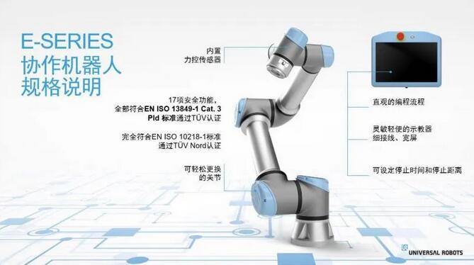 e系列符合国际安全标准——EN ISO 13849-1和EN ISO 10218-1(3类PLd)无障碍人机协作机械安全标准,例如:可设定机械臂保护性停止的停止时间和停止距,这些功能都经过了TüV Nord认证。据我们所知,这项功能还未见于其他任何协作机器人,大幅减少了预先部署风险评估的复杂度和不确定性。